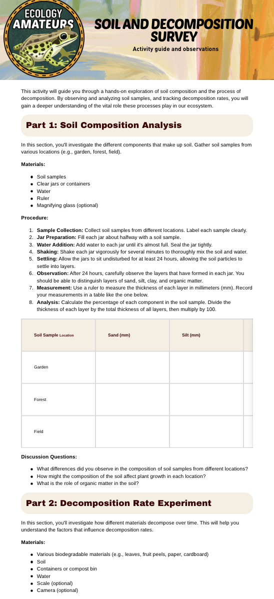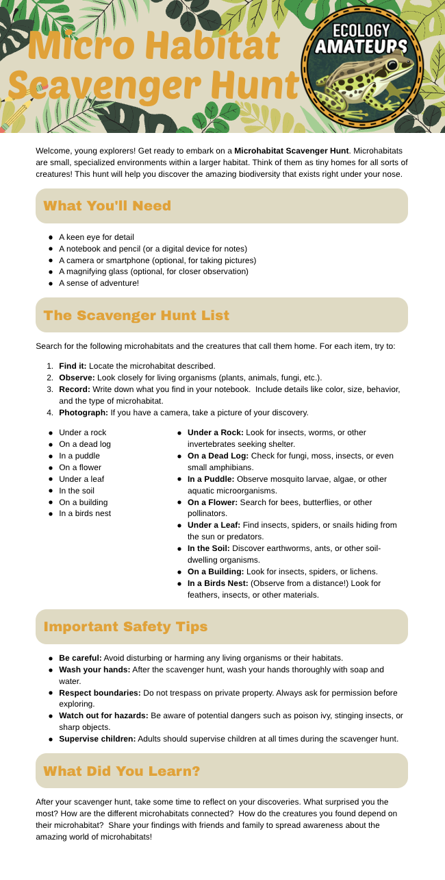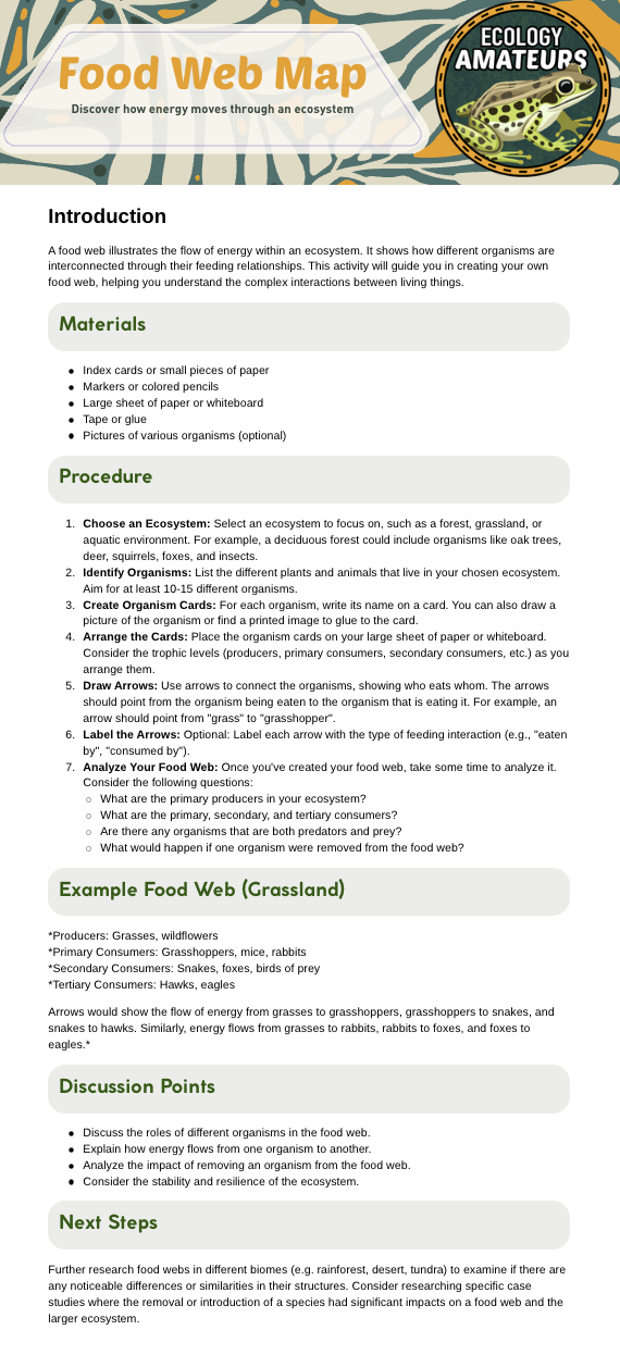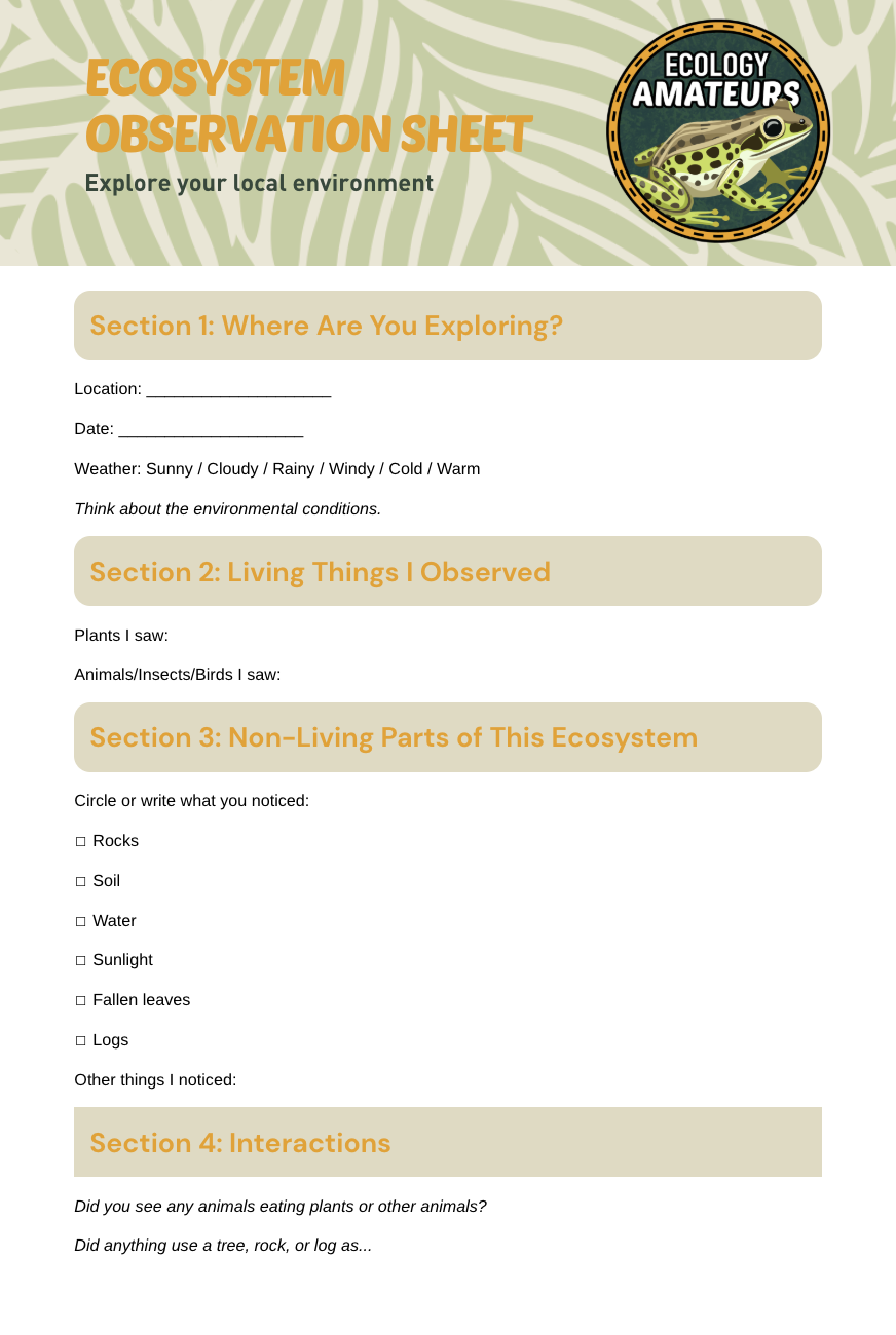 Learning ecology doesn’t happen best on a screen; it happens outside, where patterns, species, and systems come to life. These field trip worksheets are designed to guide you through real-world observation, helping you explore ecosystems, track species interactions, map food webs, and notice seasonal changes wherever you are. Whether you’re visiting a nature center, hiking a trail, or observing your own backyard, these tools turn everyday nature experiences into hands-on ecology lessons that build curiosity, critical thinking, and a deeper connection to the natural world.
